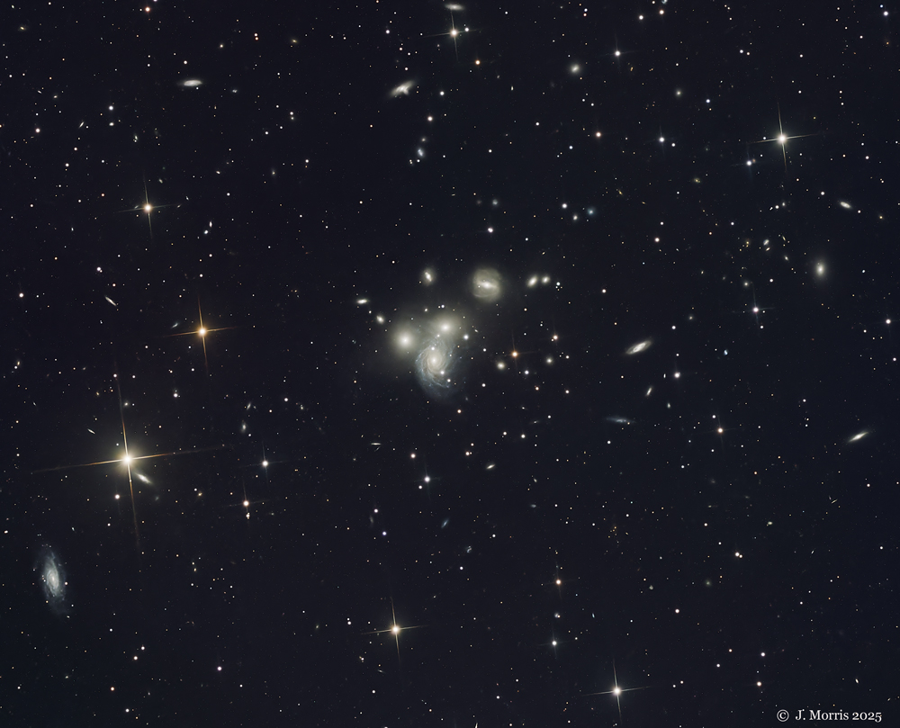 From Wikipedia, the free encyclopedia “NGC 70 is a spiral galaxy located in the constellation Andromeda. It was discovered on October 7, 1855, by R. J. Mitchell and was observed on December 19, 1897, by Guillaume Bigourdan from France who described it as "extremely faint, very small, round, between 2 faint stars". NGC 70 is a member of a compact group of seven or eight galaxies, sometimes called the NGC 70 Group or the VV 166 Group. The group comprises three relatively bright galaxies: 70, 71 and 72 in the NGC catalog, and four fainter galaxies. NGC 68 appears to be a group member, but its discrepant radial velocity and lack of tidal distortion suggest that it may be an unrelated galaxy along the group's line of sight. In photographs, the NGC 70 group resembles the much more famous Stephan's Quintet group, and it is a popular target for amateur astrophotographers.” |